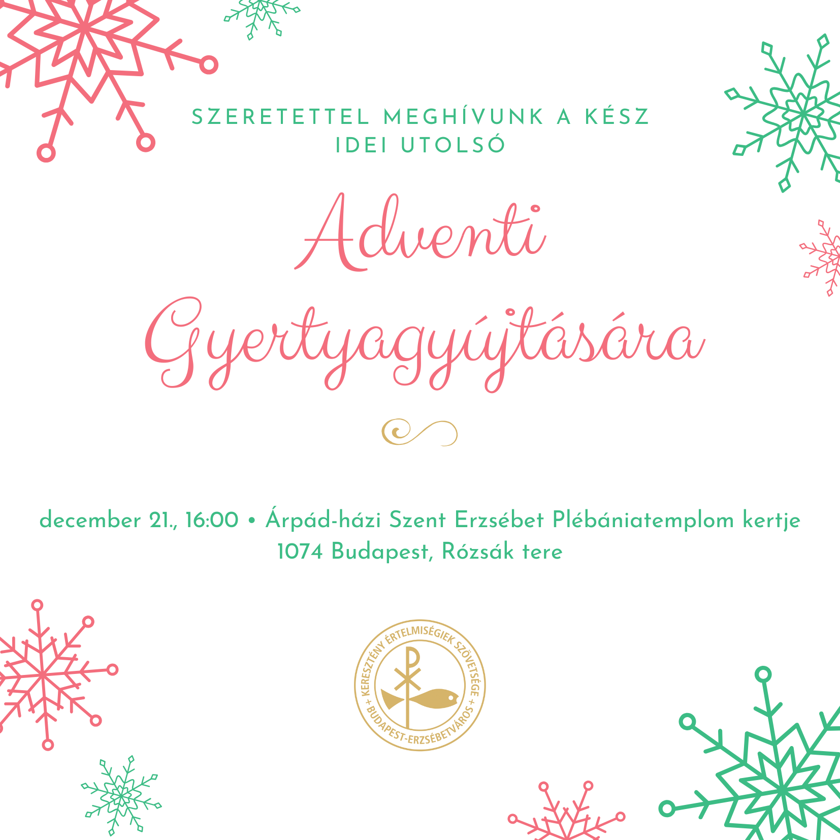 A KÉSZ budapest-erzsébetvárosi csoportja gyertyagyújtást szervez advent negyedik vasárnapján, december 21-én 16 órakor az Árpád-házi Szent Erzsébet-plébániatemplom kertjében (Bp., VII., Rózsák tere). Minden érdeklődőt szeretettel várnak a szervezők!