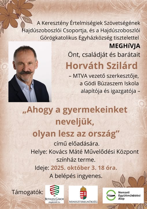 A KÉSZ hajdúszoboszlói csoportjának meghívására tart előadást Horváth Szilárd, az MTVA vezető szerkesztője, a gödi Búzaszem Iskola alapítója és igazgatója Ahogyan a gyermekeinket neveljük, olyan lesz az ország címmel október 3-án, pénteken 18 órakor a Kovács Máté Városi Művelődési Központ színháztermében (Hajdúszoboszló, Szilfákalja 2.).
