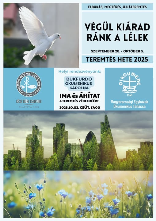 A KÉSZ büki csoportja a teremtés hete programsorozat keretében imádságos áhítatot tart október 2-án, csütörtökön 17 órakor a bükfürdői ökumenikus kápolnában.