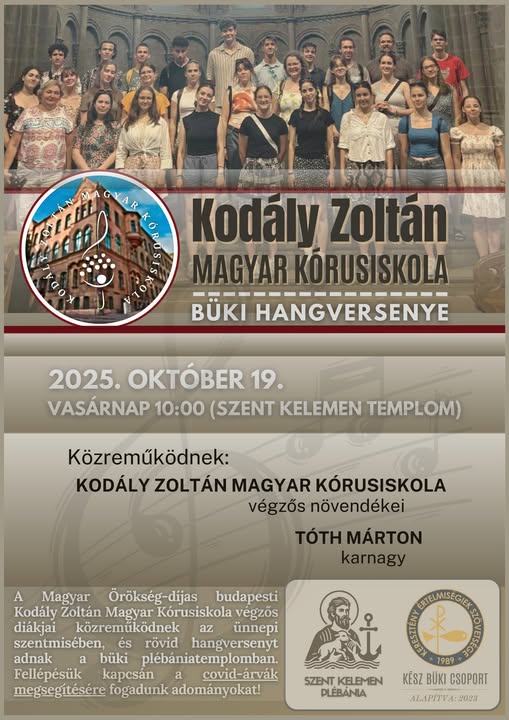 A KÉSZ büki csoportja és a Szent Kelemen Plébánia jótékonysági hangversenyt szervez október 19-én, vasárnap a 10 órakor kezdődő ünnepi szentmisét követően a budapesti Kodály Zoltán Magyar Kórusiskola végzős növendékeinek közreműködésével. Vezényel