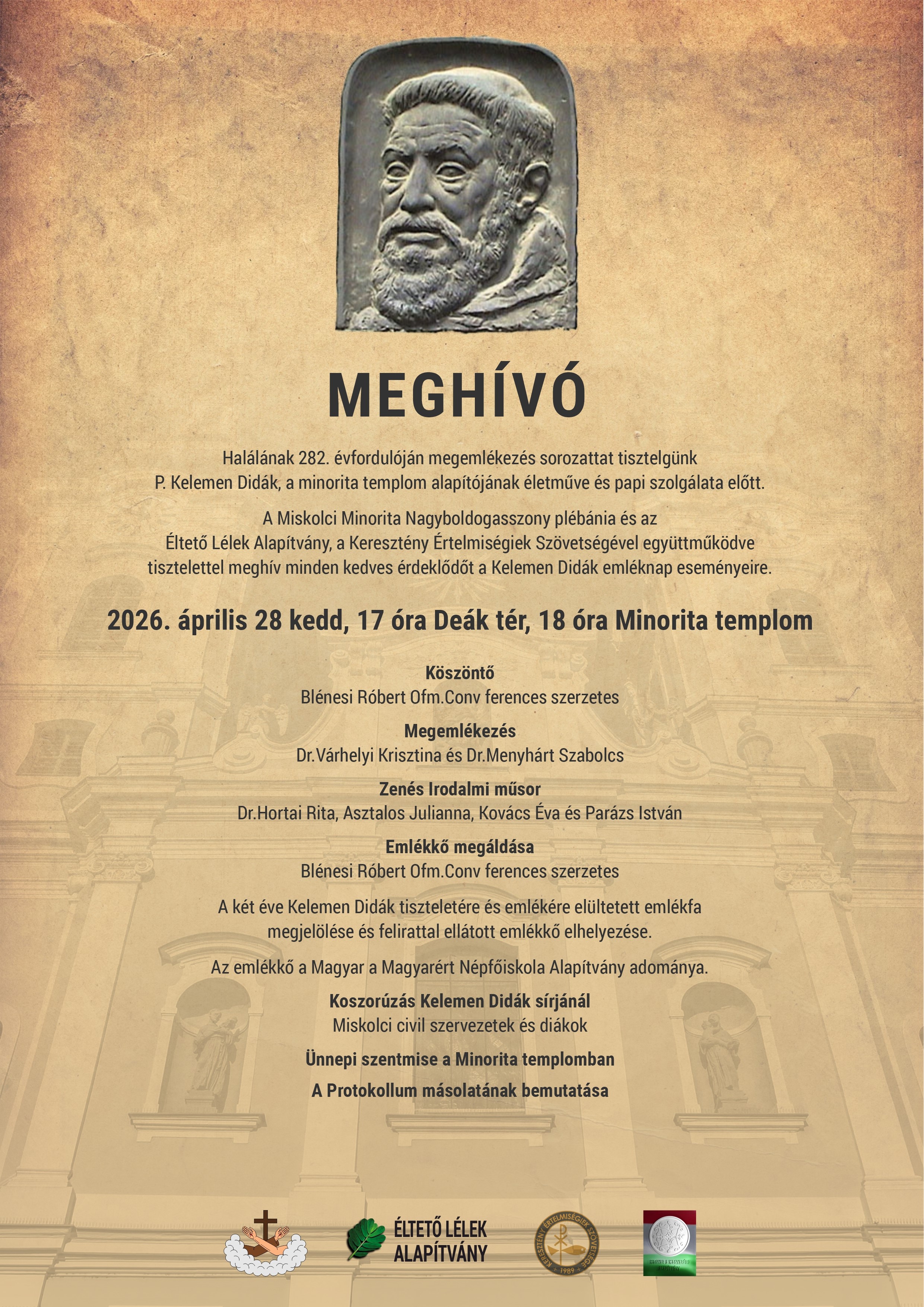 A KÉSZ miskolci csoportja együttműködve az Éltető Lélek Alapítvánnyal és a Miskolci Minorita Nagyboldogasszony Plébániával emléknapot szervez Kelemen Didák halálának 282. évfordulója alkalmából.