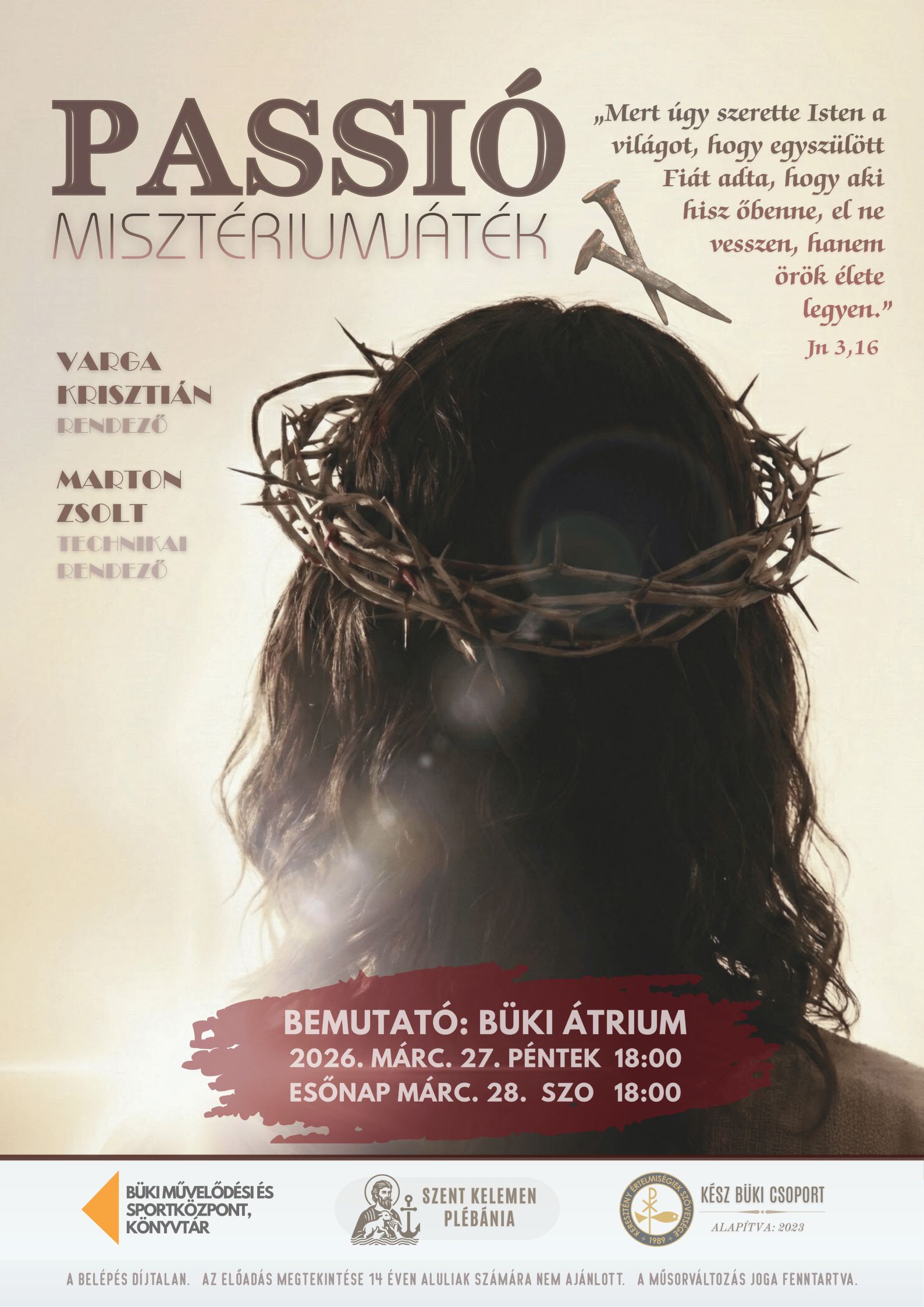 A Passió c. misztériumjáték bemutatására készül a Keresztény Értelmiségiek Szövetsége büki csoportja. A helyi és környékbeli hívek közreműködésével színre vitt különleges előadás március 27-én, pénteken 18 órakor debütál az Átrium Rendezvénytér (Bük, Eötvös u. 9.) szabadtéri színpadán.