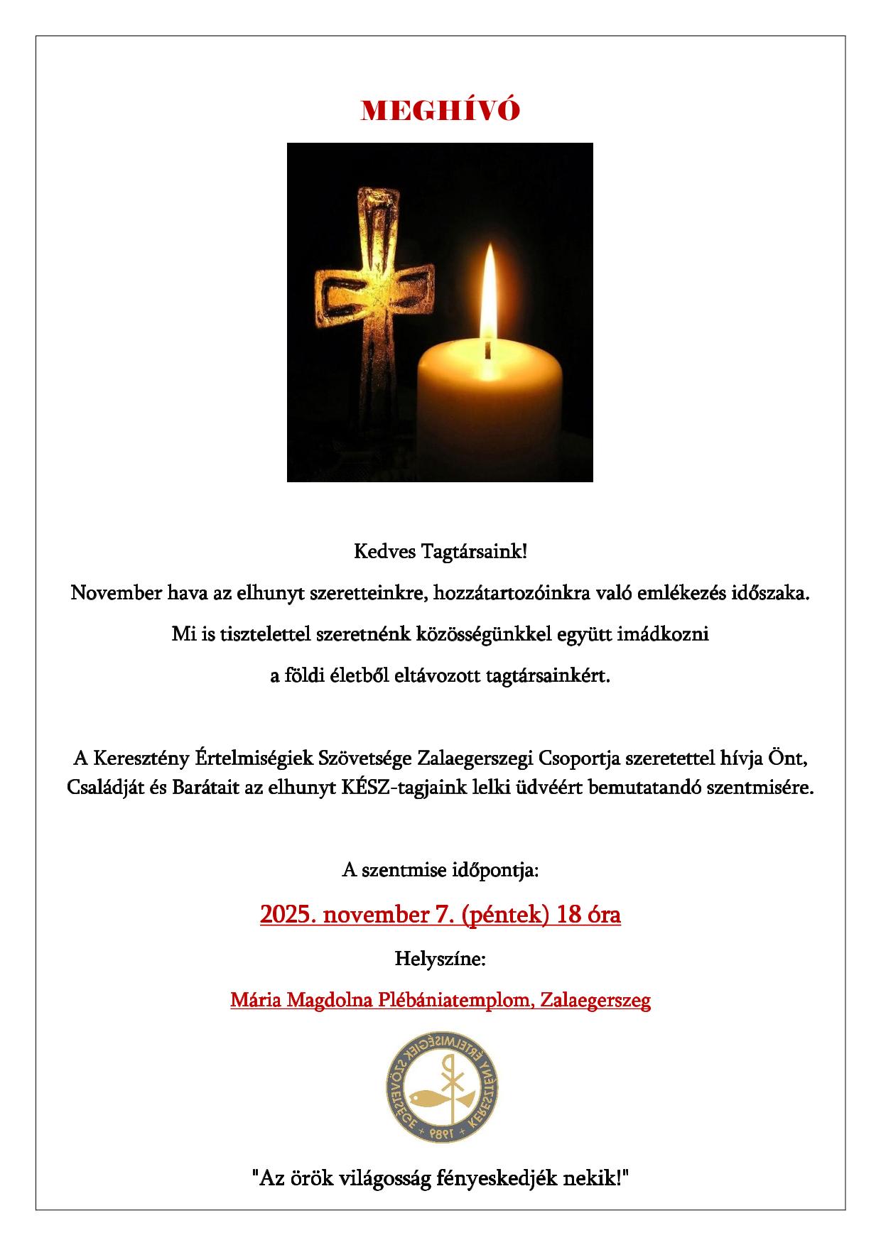 A KÉSZ zalaegerszegi csoportja szentmisét szervez az elhunyt KÉSZ-tagok lelki üdvösségéért november 7-én, pénteken 18 órakor a Mária Magdolna-plébániatemplomban (Zalaegerszeg, Mindszenty tér 1.).