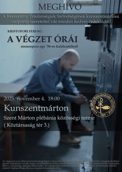 Kristofori Ferenc magánénekes előadásában november 4-én, kedden 18 órakor a Szent Márton Plébánia közösségi termében (Kunszentmárton, Köztársaság tér 3.). A belépés díjtalan.