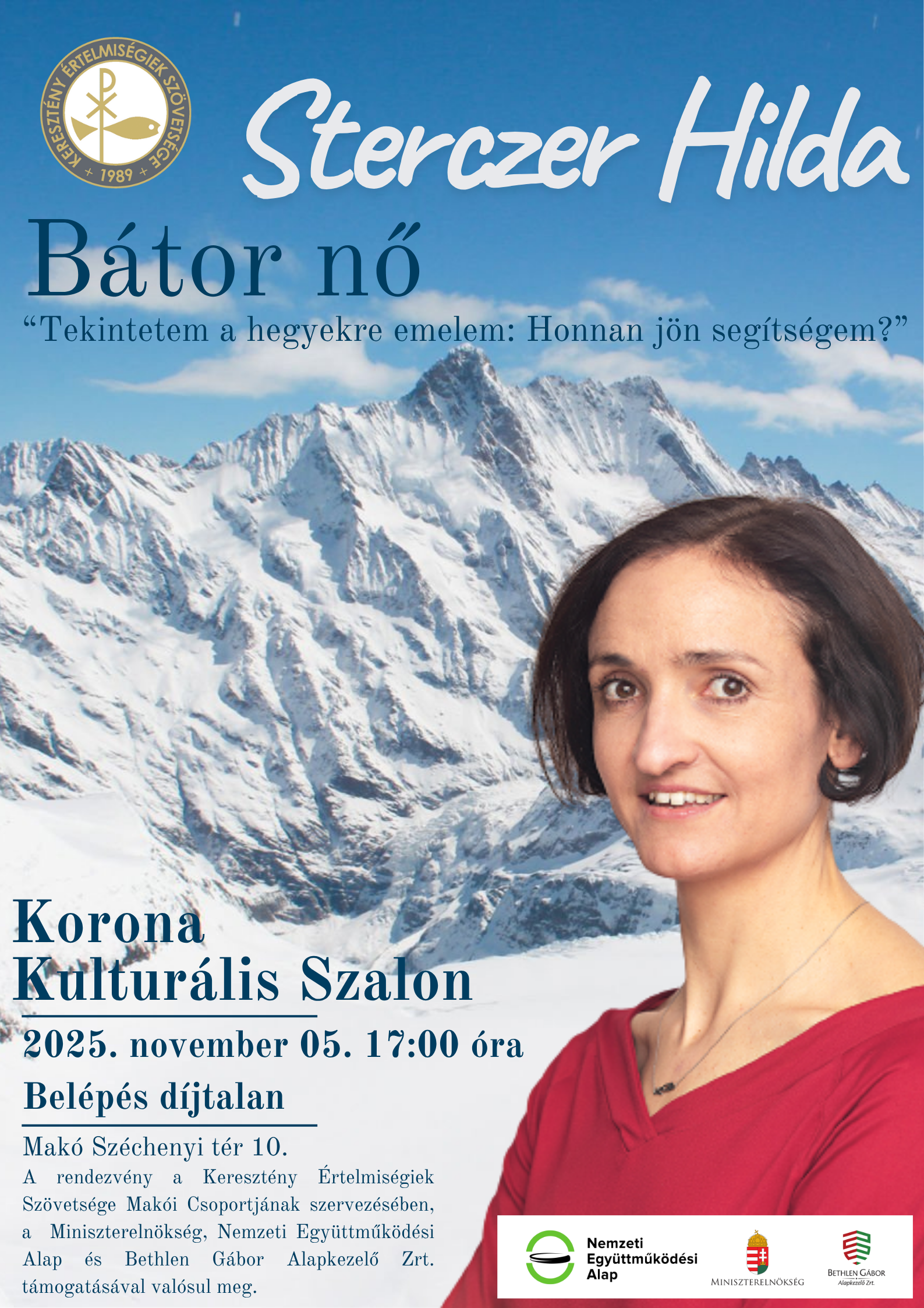 Bátor nő - "Tekintetem a hegyekre emelem: Honnan jön segítségem?" címmel november 5-én, szerdán 17 órakor a Korona Kulturális Szalonban (Makó, Széchenyi tér 10.).