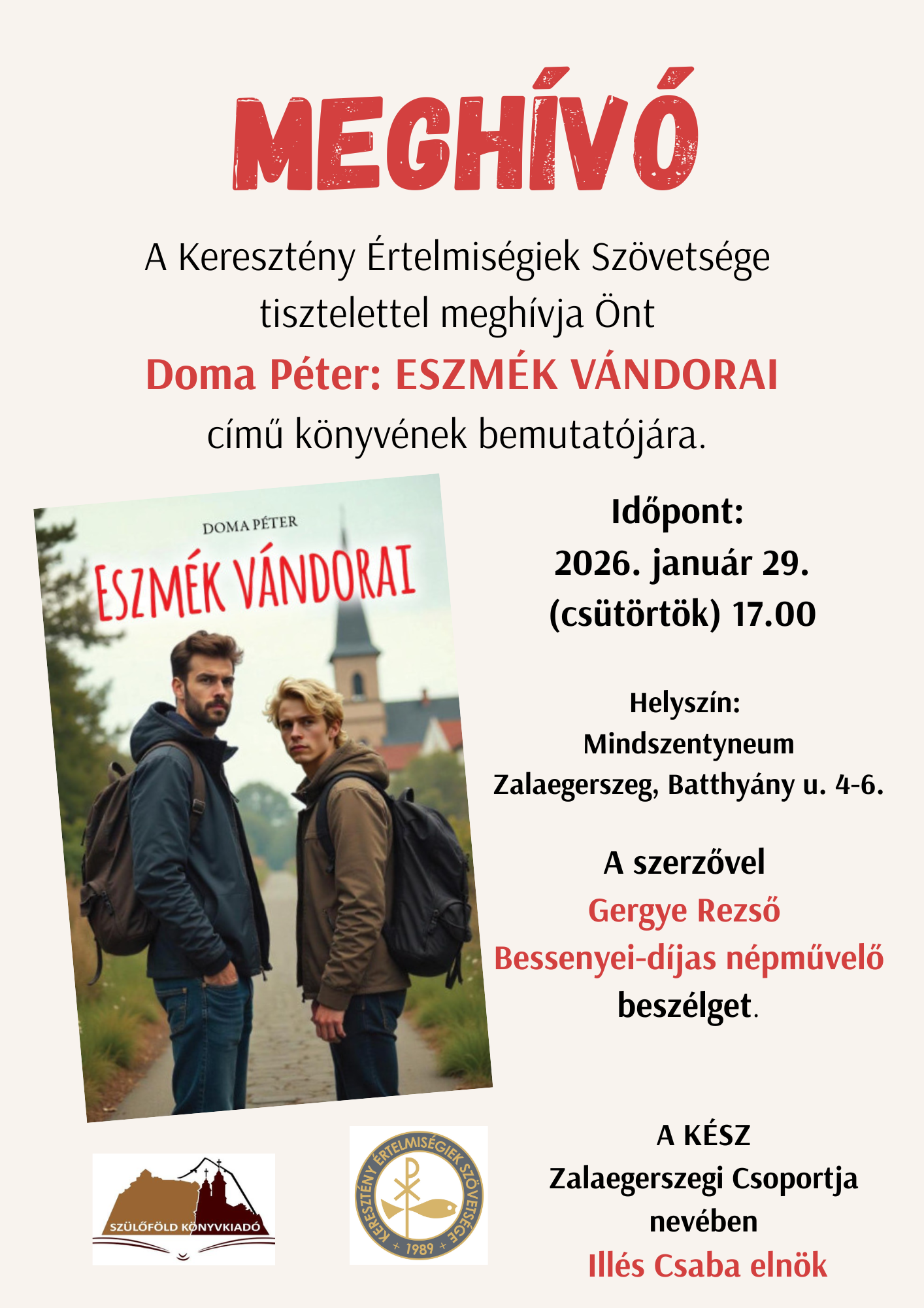 A KÉSZ zalaegerszegi csoportjának szervezésében kerül bemutatásra Doma Péter: Eszmék vándorai című könyve január 29-én, csütörtökön 17 órakor a Mindszentyneumban (Zalaegerszeg, Batthyány u. 4–6.). A szerzővel Gergye Rezső Bessenyei-díjas népművelő beszélget.