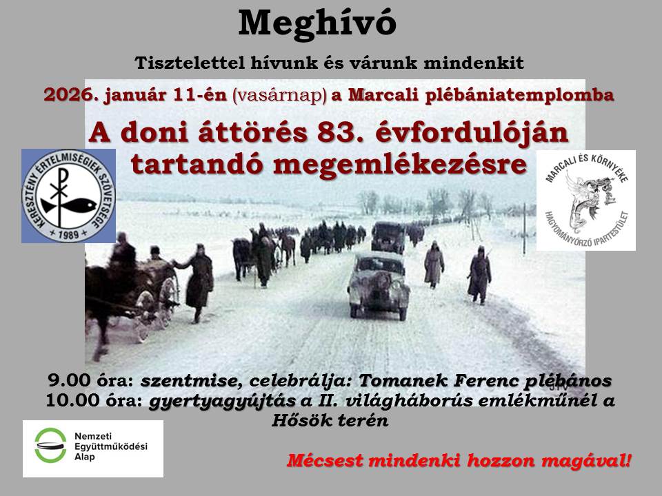 A KÉSZ marcali csoportja és a Marcali és Környéke Hagyományörző Egyesület a doni áttörés 83. évfordulója alkalmából megemlékezést szervez Marcaliban január 11-én, vasárnap. 9 órakor szentmisét celebrál Tomanek Ferenc plébános a Gyümölcsoltó Boldogasszony-plébániatemplomban (Marcali, Hősök tere), majd 10 órakor gyertyagyújtás a Hősök terén, a II. világháborús emlékműnél.