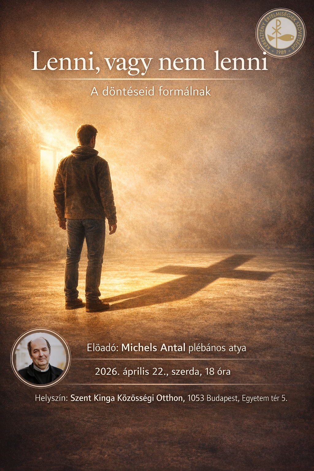 A KÉSZ budapest-belvárosi csoportja meghívására tart lelkiségi, gondolatébresztő előadást és válaszol az érdeklődők kérdéseire Michels Antal esperes, a Bp.-Józsefvárosi Szent József-plébánia plébánosa Lenni, vagy nem lenni – A döntéseid formálnak címmel április 22-én, szerdán 18 órakor a a Szent Kinga Közösségi Otthonban (Budapest V., Egyetem tér 5. I. em. 5., a lift mellett balra, a kapunál 10-es kapucsengő).