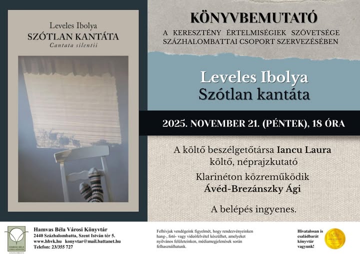 A KÉSZ százhalombattai csoportjának szervezésében kerül bemutatásra Leveles Ibolya költő Szótlan kantáta című könyve november 21-én, pénteken 18 órakor a Hamvas Béla Városi Könyvtárban (Százhalombatta, Szent István tér 5.).