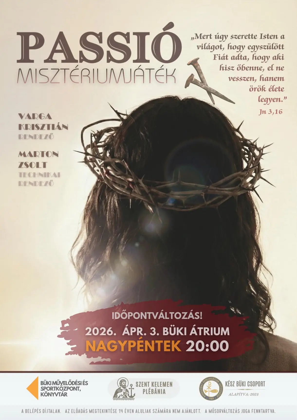 A Passió c. misztériumjáték bemutatására készül a Keresztény Értelmiségiek Szövetsége büki csoportja. A helyi és környékbeli hívek közreműködésével színre vitt különleges előadás új időpontban, április 3-án, pénteken 20 órakor debütál az Átrium Rendezvénytér (Bük, Eötvös u. 9.) szabadtéri színpadán.