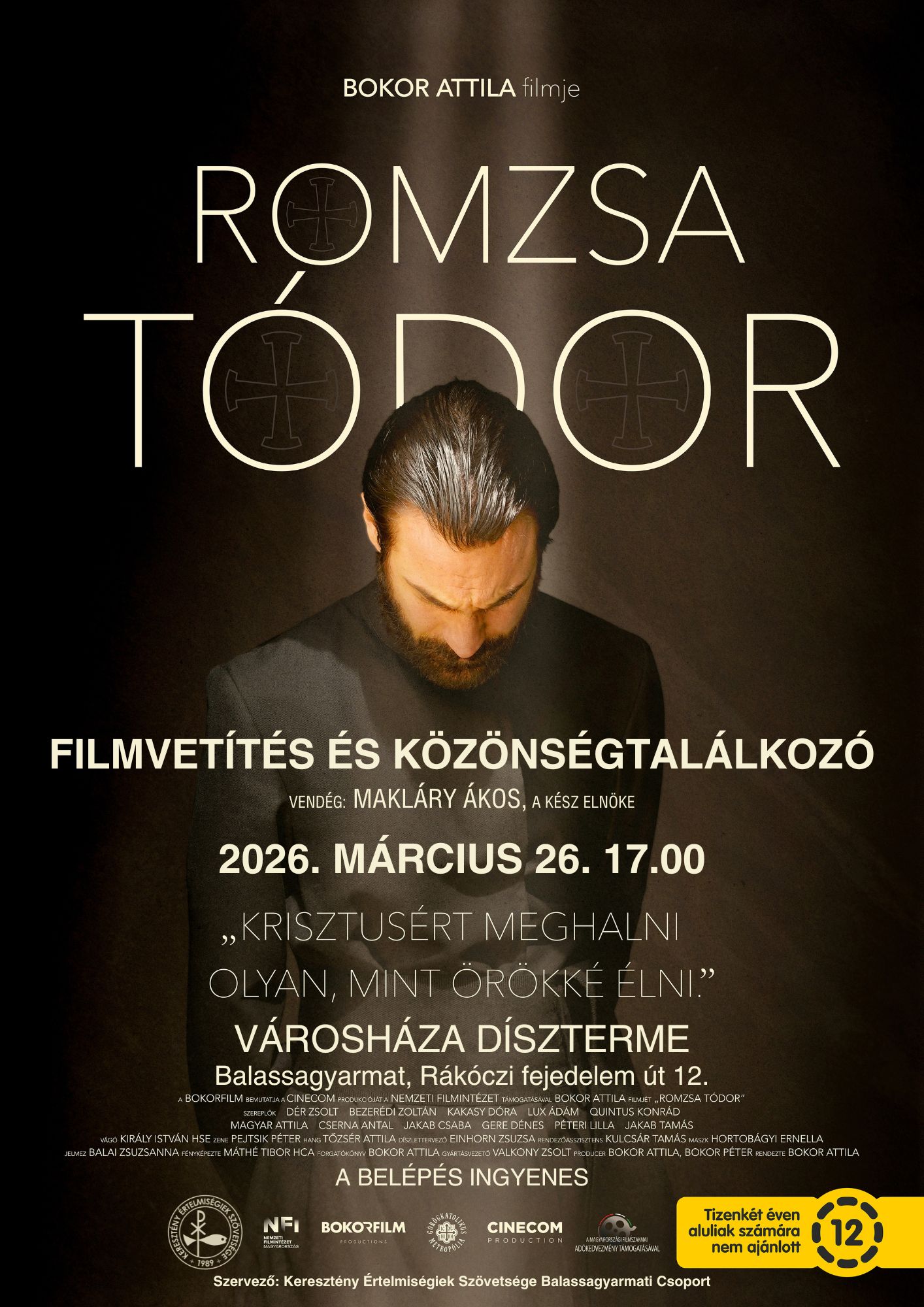 A KÉSZ balassagyarmati csoportja taggyűlést szervez, melynek keretében kerül sor a Romzsa Tódor c. magyar életrajzi dráma nyilvános vetítésre március 26-án, csütörtökön 17 órakor a városháza dísztermében (Balassagyarmat, Rákóczi fejedelem út 12.). A filmvetítés után beszélgetés Makláry Ákossal, a KÉSZ elnökével, aki Jevreinov püspök szerepében jelenik meg a vásznon, és szakértőként is végigkísérte az alkotást, a szentírási, teológiai és liturgikus pontosságot szem előtt tartva.