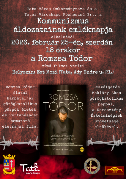 Tatán a helyi KÉSZ-csoport közreműködésével, a kommunizmus áldozatainak emléknapja alkalmából vetítik a Romzsa Tódor c. életrajzi filmet az Est Moziban (Ady Endre u. 21.) február 25-én, szerdán 18 órakor. A filmbemutatót követően beszélgetés Makláry Ákos görögkatolikus pappal, a KÉSZ elnökével. A belépés díjtalan.