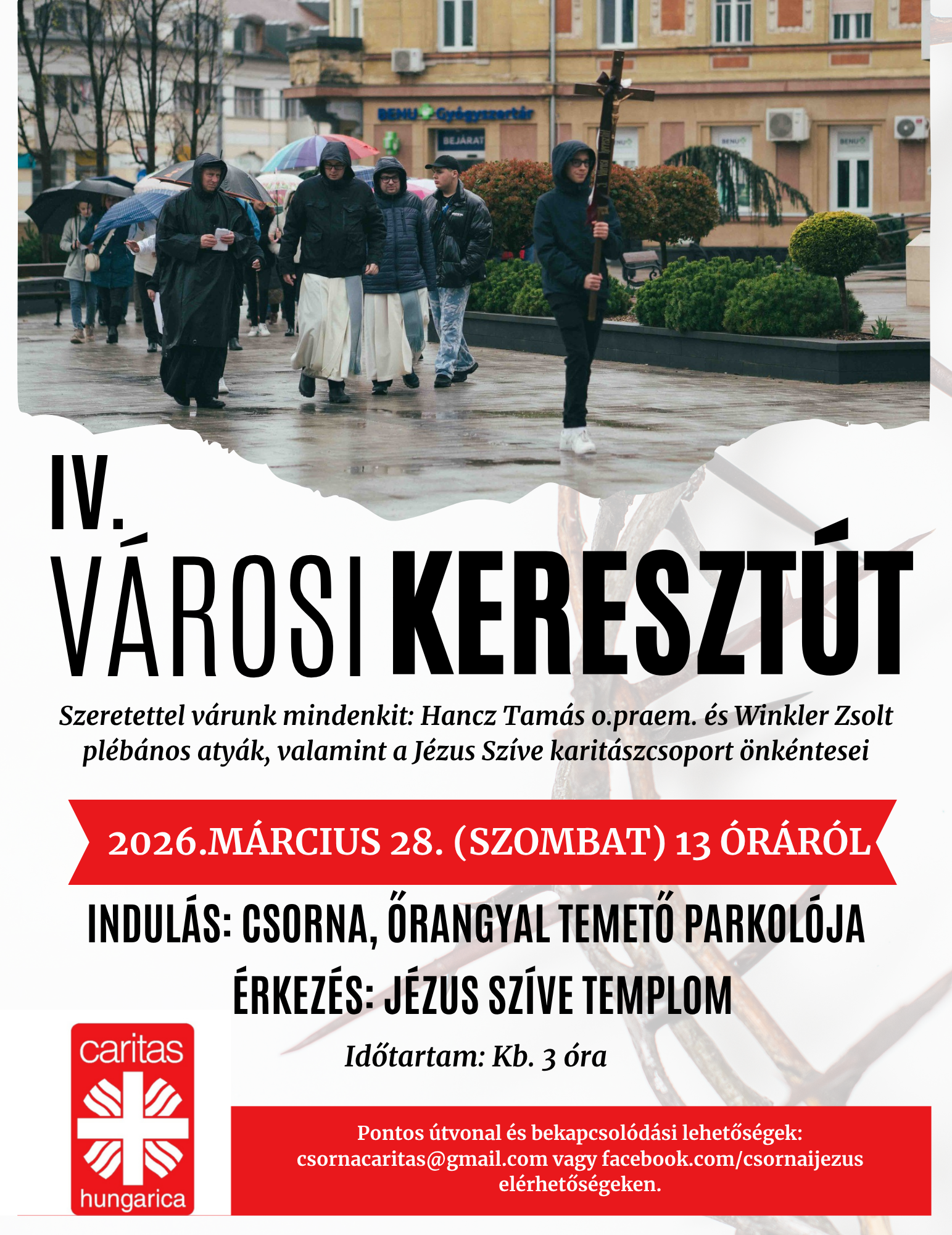 Keresztútjárást szervez Csornán a helyi karitász március 28-án, szombaton 13 órától. Indulás az Őrangyaltemető parkolójából. Érkezés a Jézus Szíve-templomhoz várhatóan 16 órakor. A városi keresztútra hívja a KÉSZ csornai csoportja a tagjait.